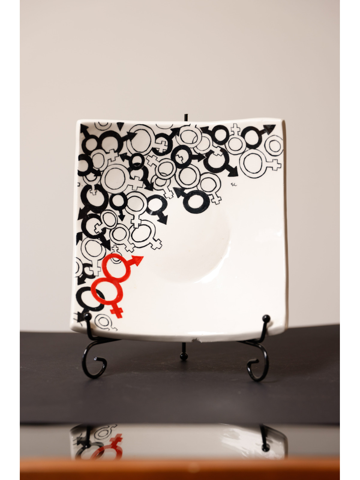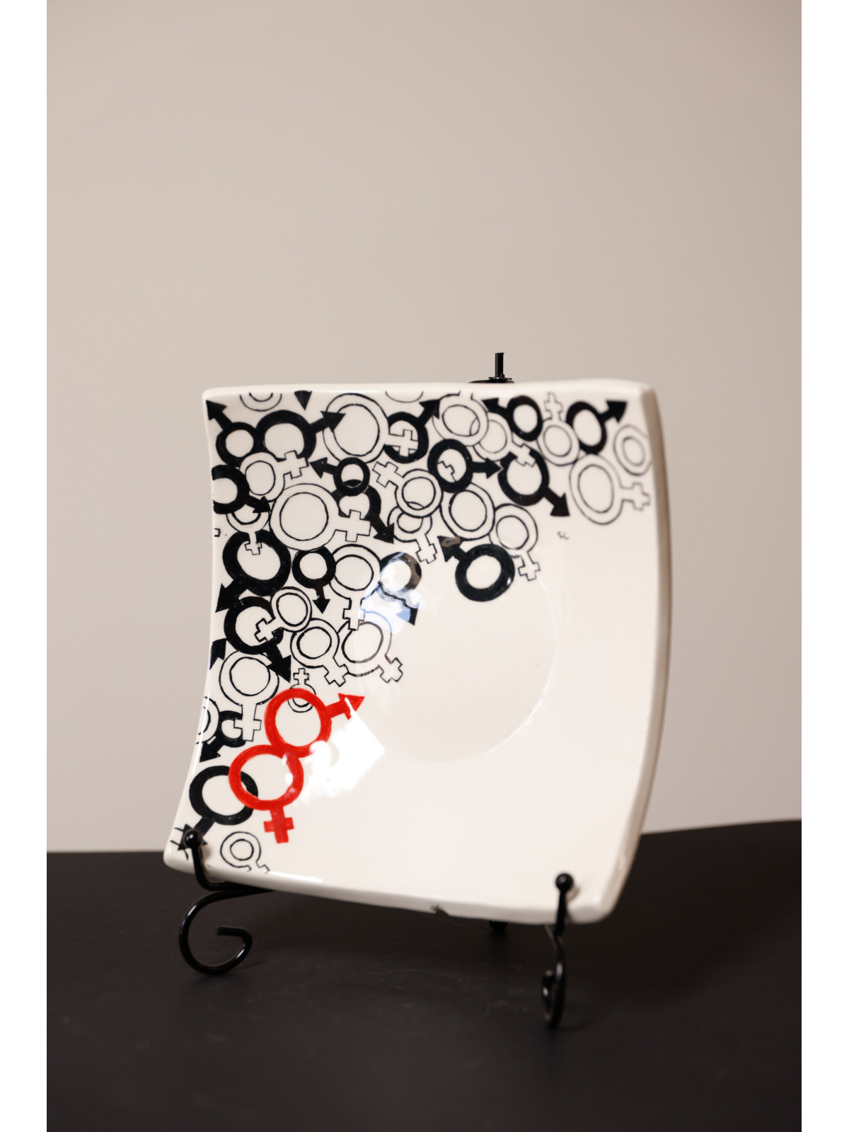 Piatto decorativo in ceramica con simboli stilizzati di lui e lei. Design moderno e romantico, perfetto come regalo per coppie, anniversari e matrimoni. Interamente dipinto a mano.