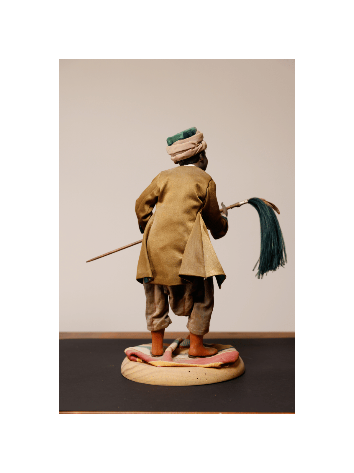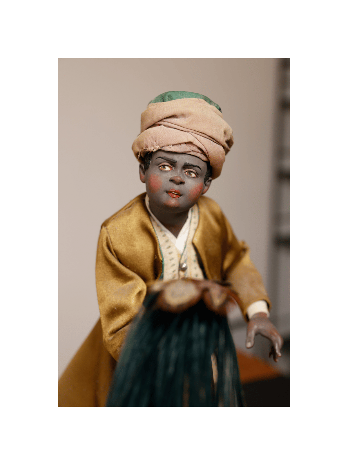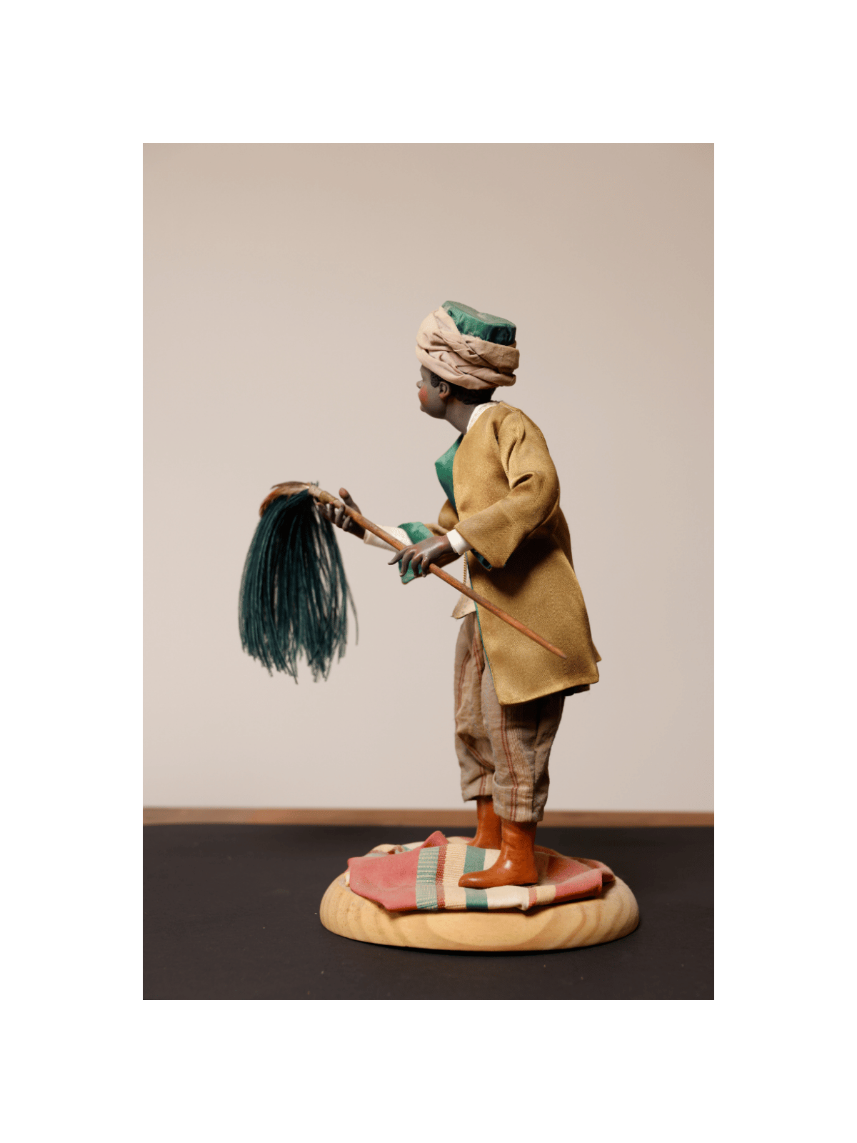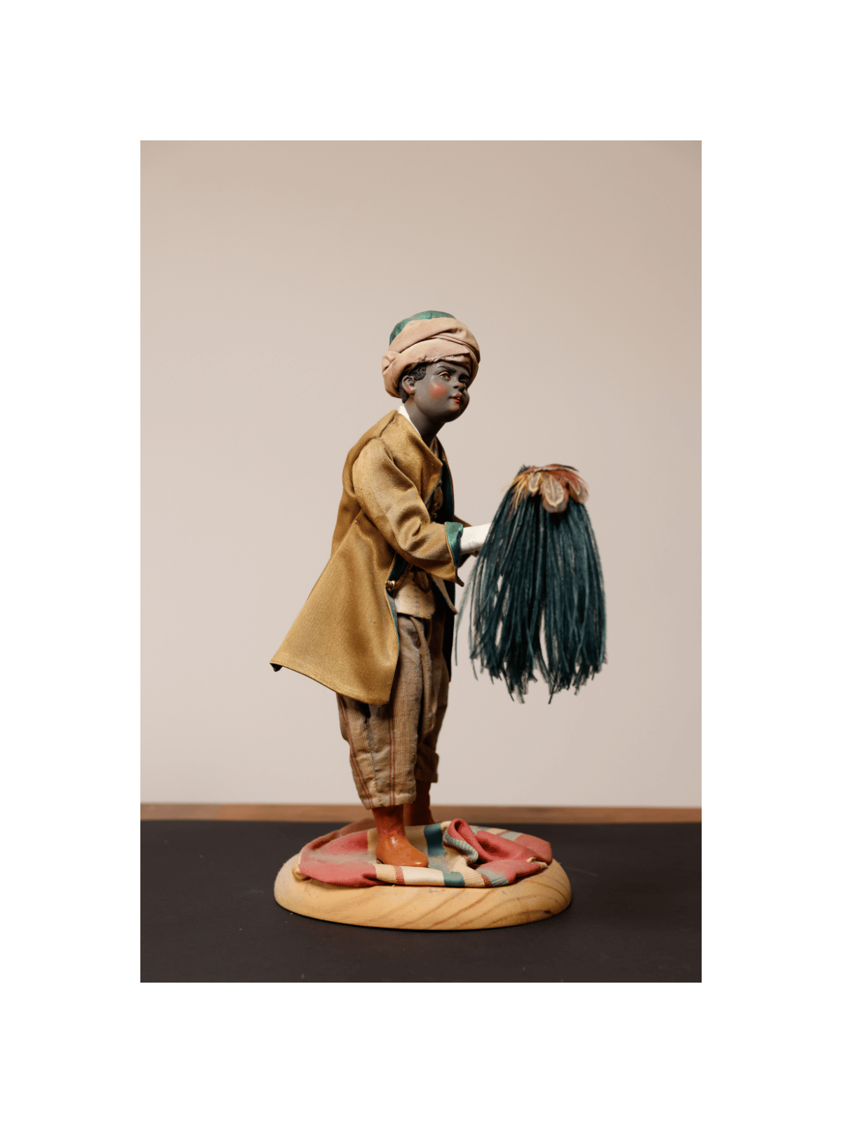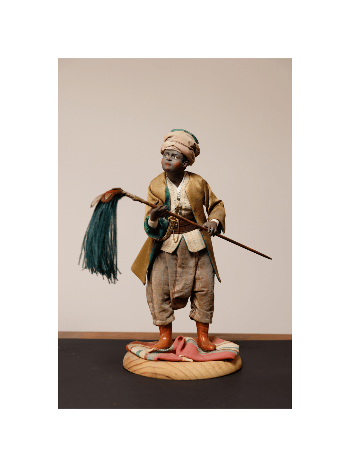 Nel corteo dei Re Magi, tra cammelli e servitori, spicca questa raffinata figura orientale: il servitore con lo scacciamosche, simbolo di servizio regale nella tradizione presepiale napoletana del Settecento.