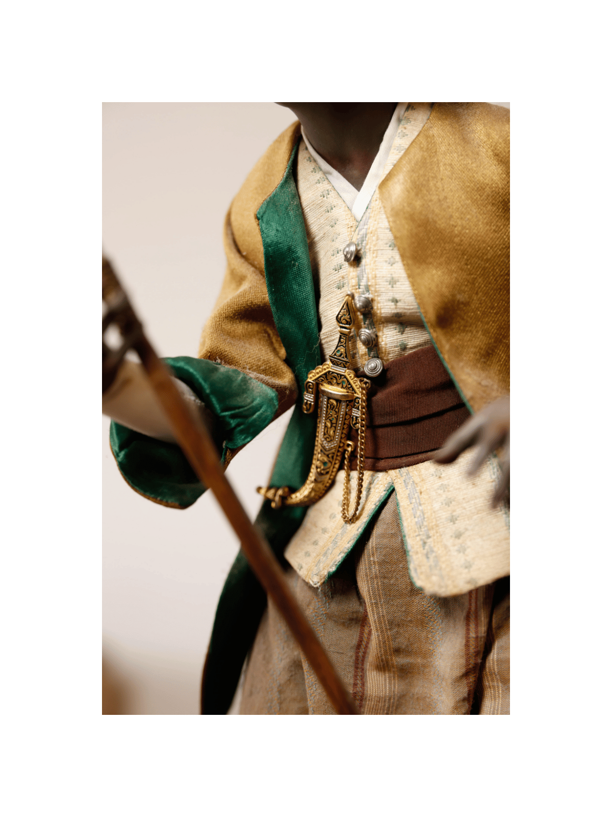 Il giovane servitore indossa abiti preziosi: turbante rosa drappeggiato, giacca ocra con risvolti turchesi, gilet avorio con ricami. In mano regge il flabello (scacciamosche), simbolo del suo ruolo al servizio dei Magi.