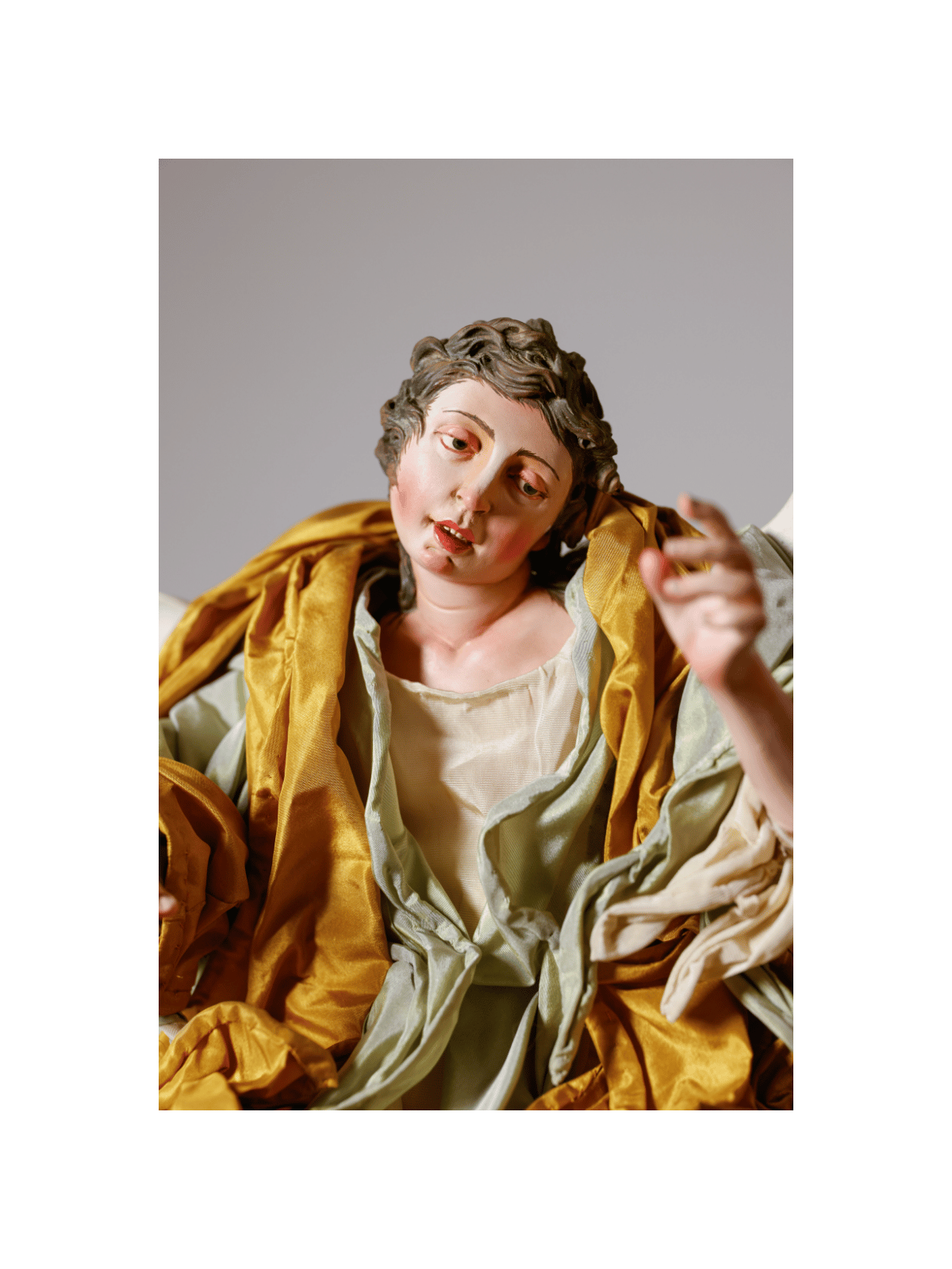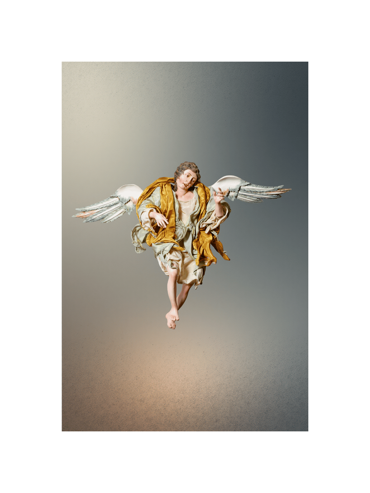 Le ali, scolpite in legno e dipinte nei toni del grigio perla, si aprono maestose ai lati della figura. Le vesti, in preziosa seta color oro antico e avorio, si muovono in un panneggio dinamico che cattura il movimento del volo, seguendo la tradizione barocca napoletana.