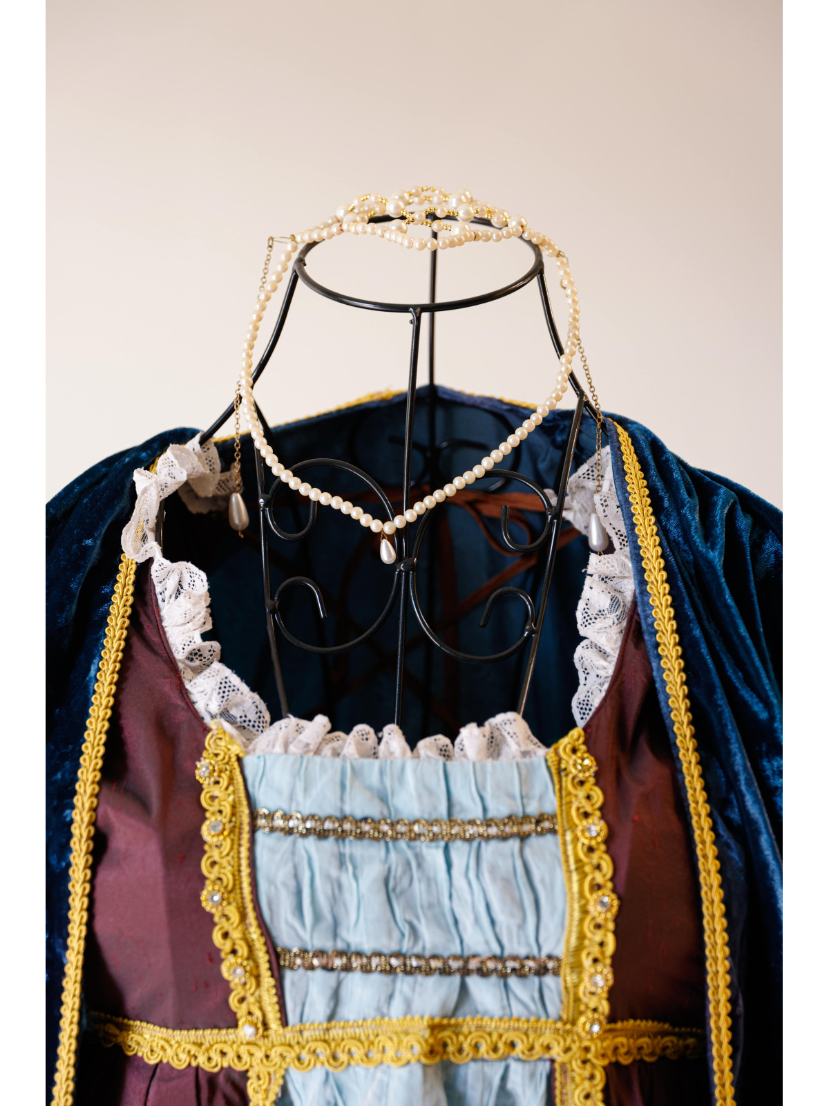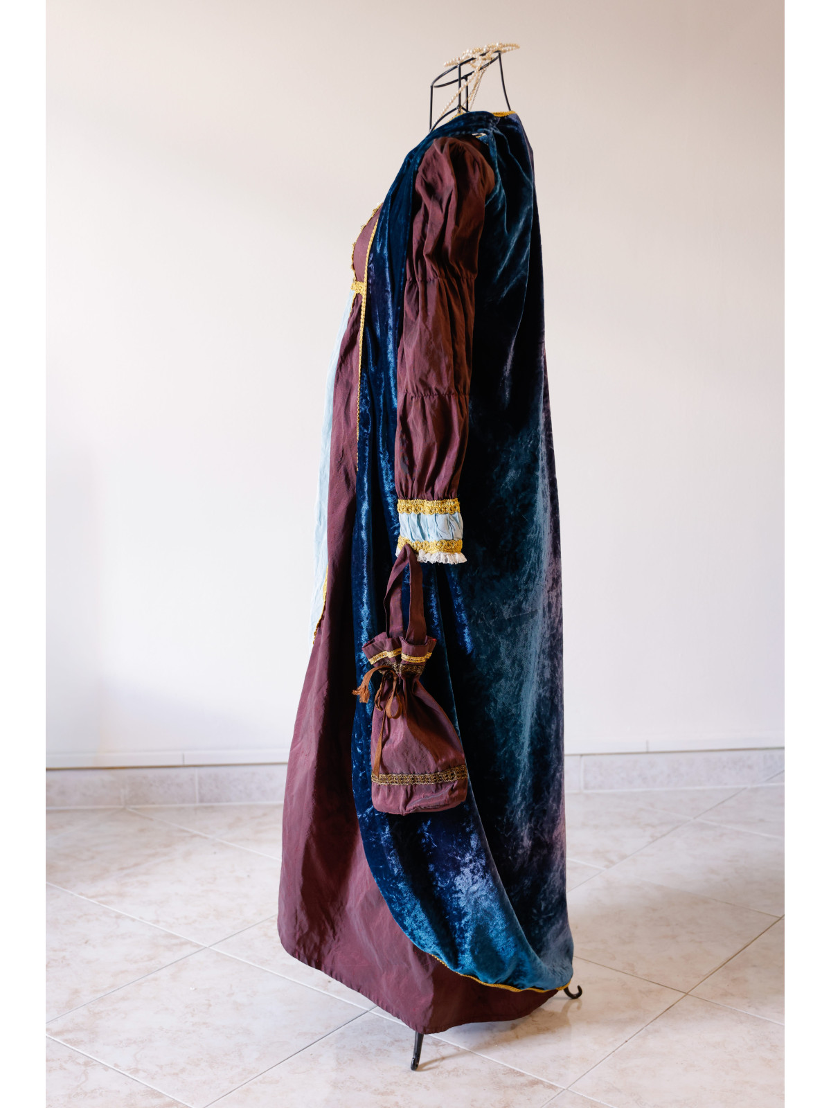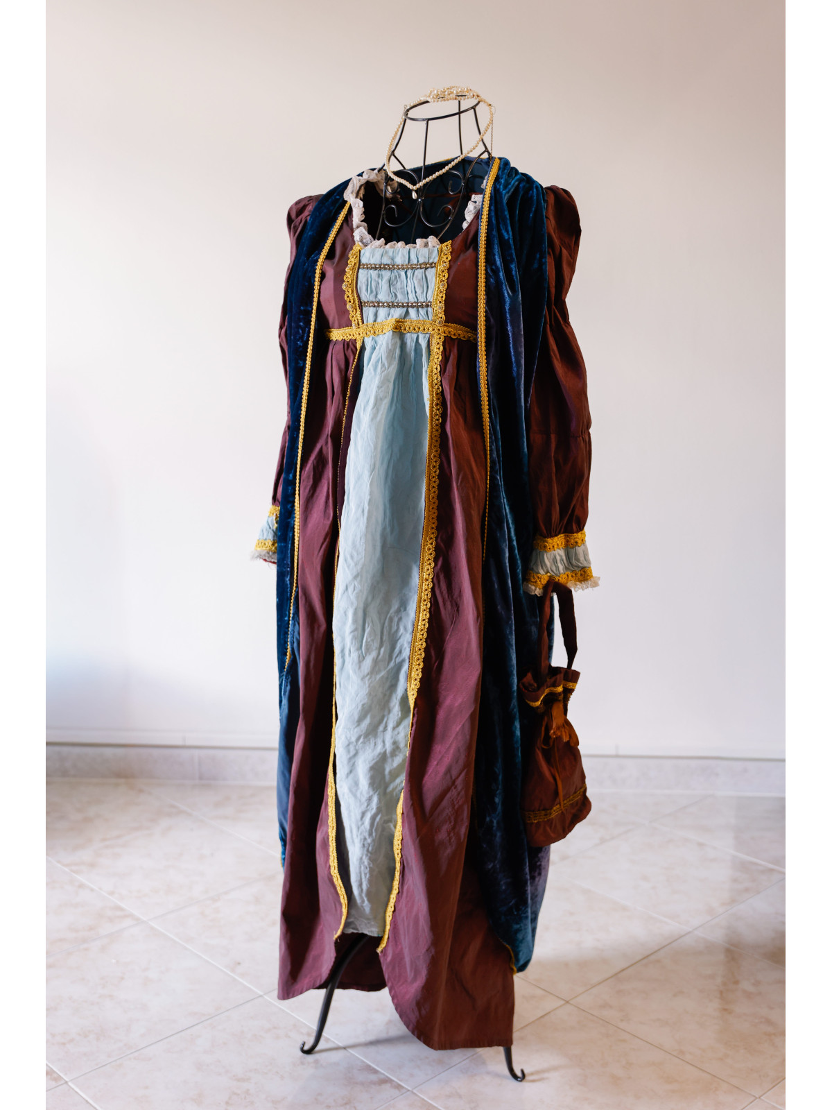 Costume storico femminile in stile rinascimentale, interamente confezionato a mano. Mantello in velluto blu con finiture oro, abito principale bordeaux, sottoveste celeste con pizzi e merletti.